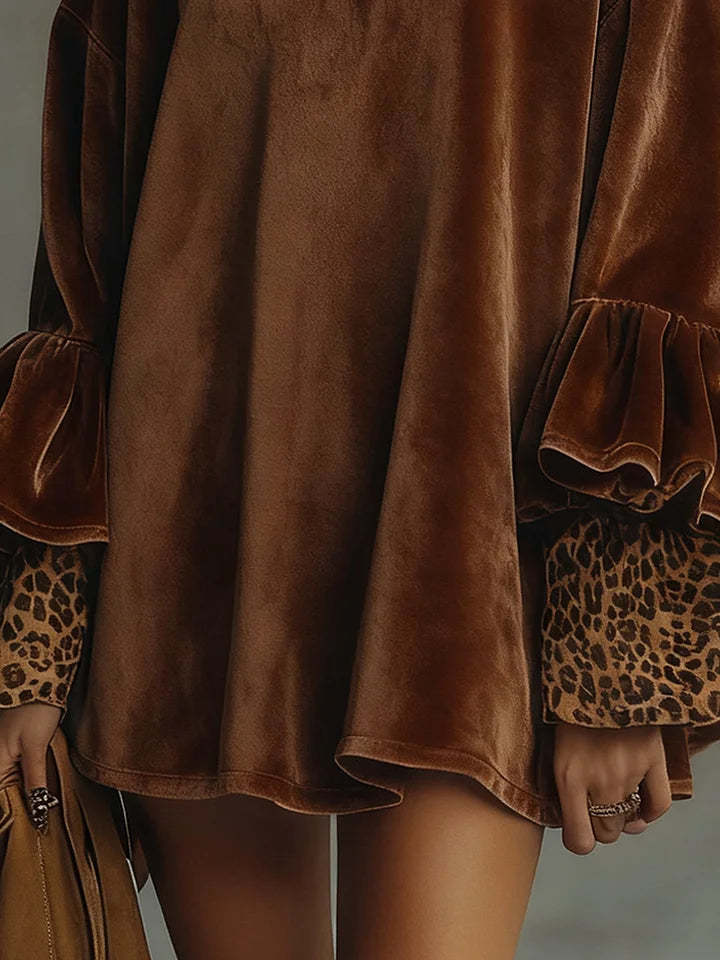 Autumn And Winter New Gold Velvet With Leopard Print Turtleneck Dress