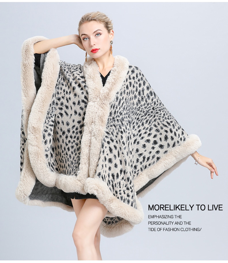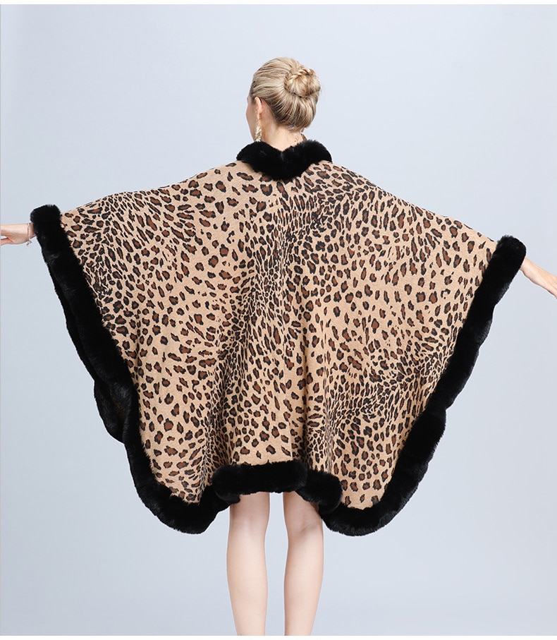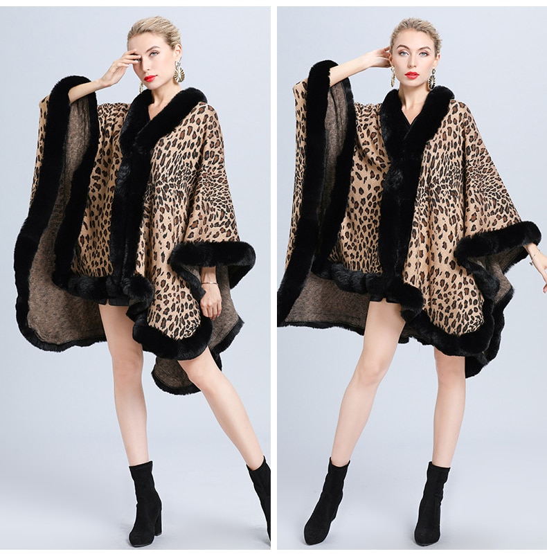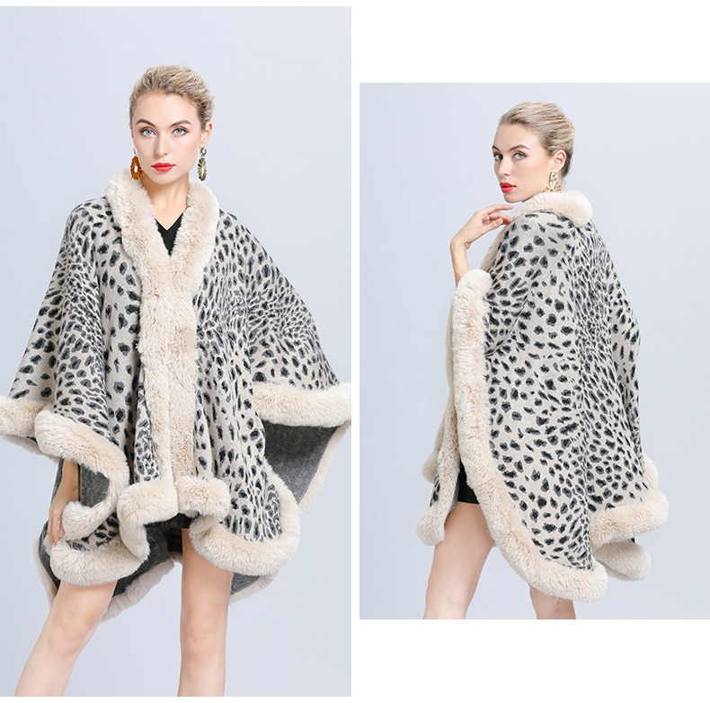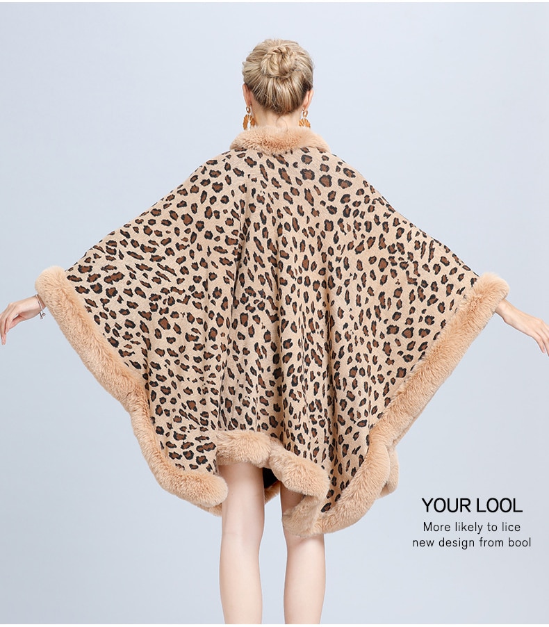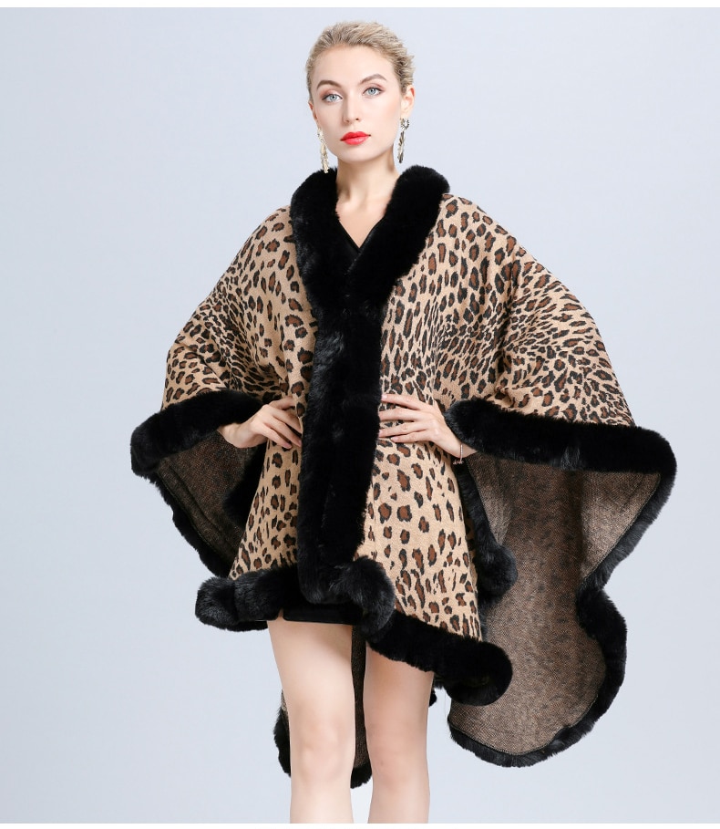 New Faux Fur Collar Leopard Print Jacquard Knitted Cardigan Shawl