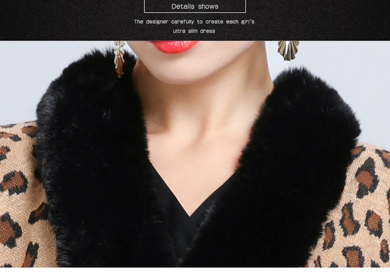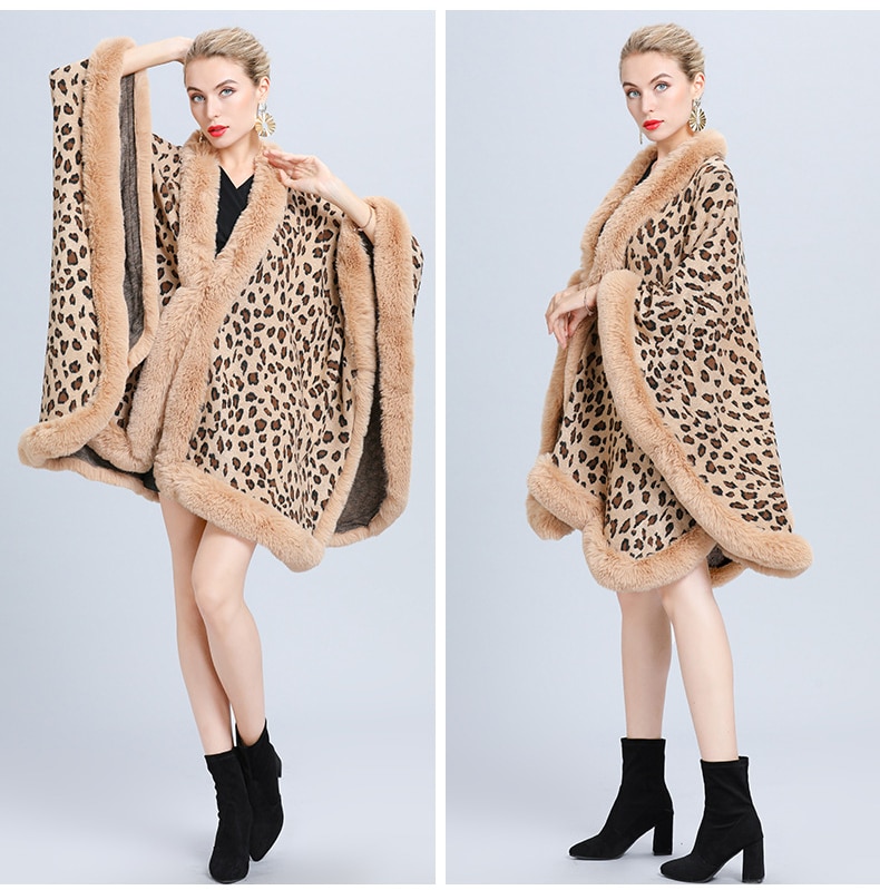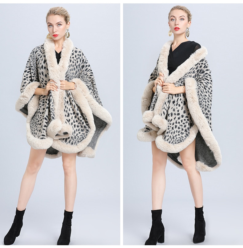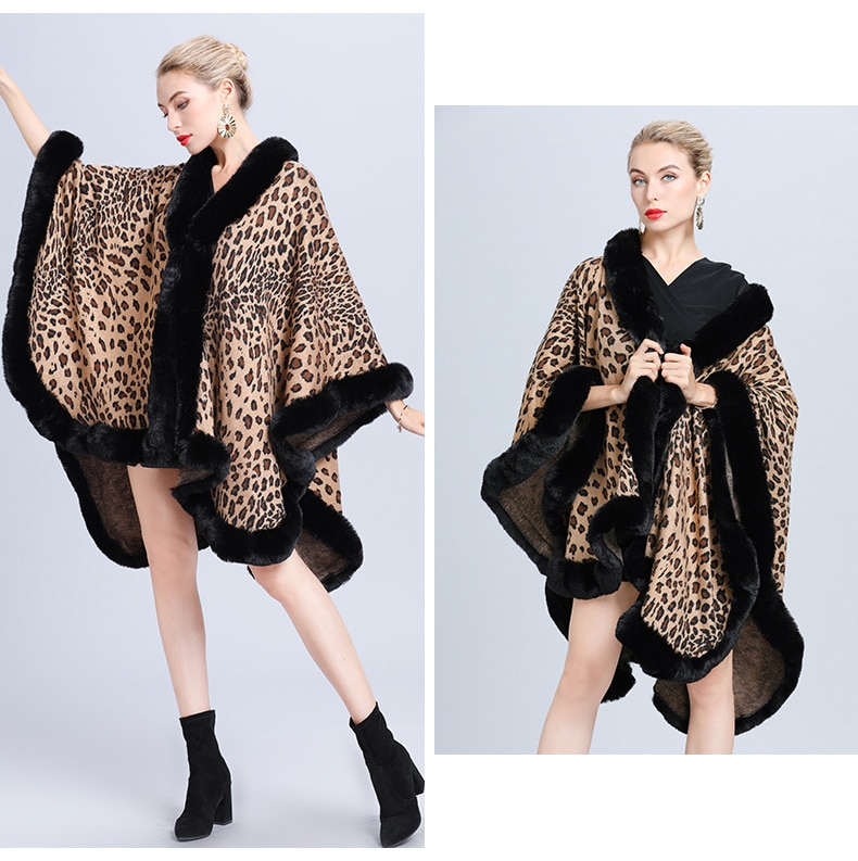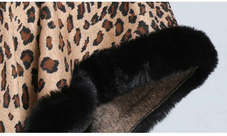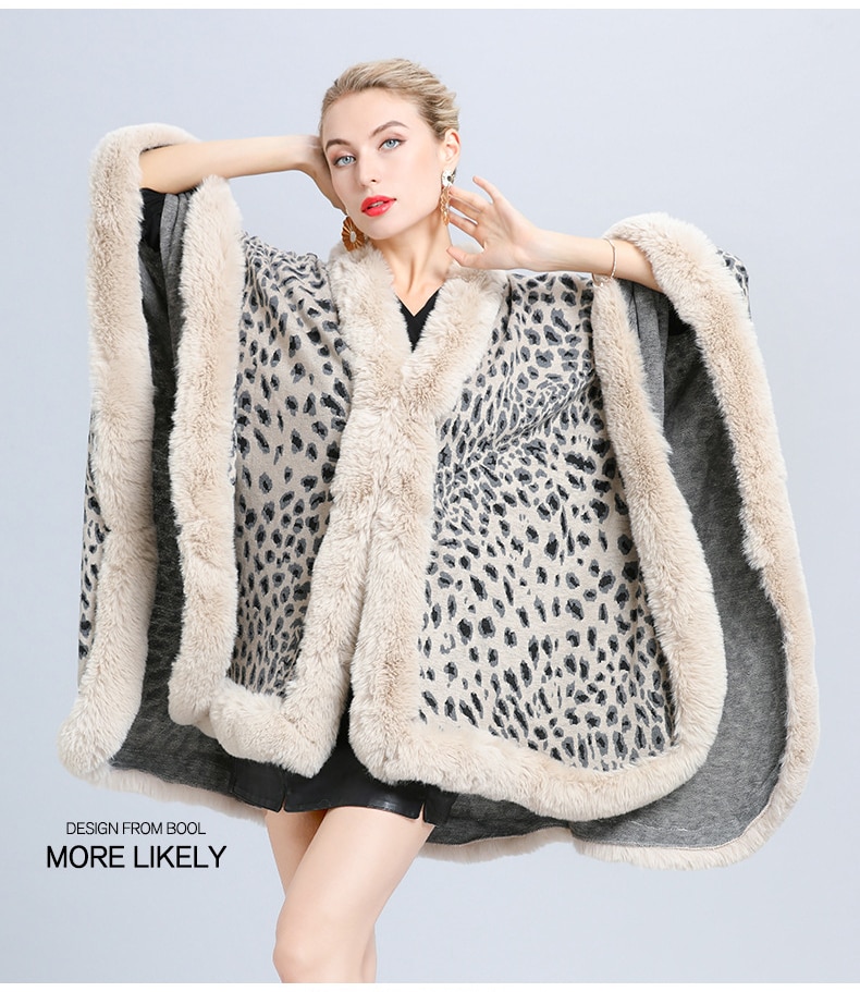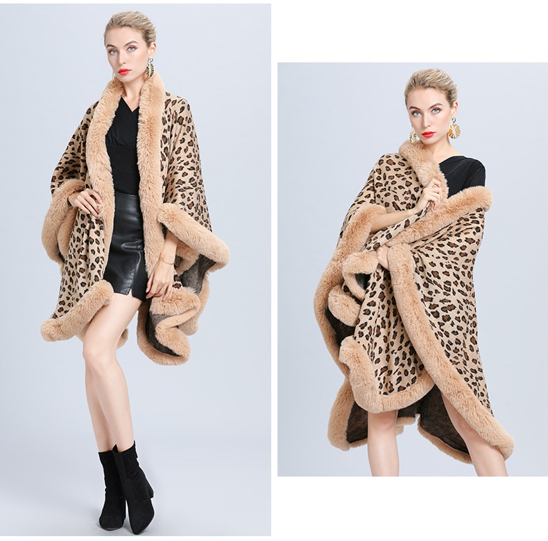 New Faux Fur Collar Leopard Print Jacquard Knitted Cardigan Shawl