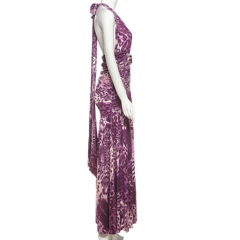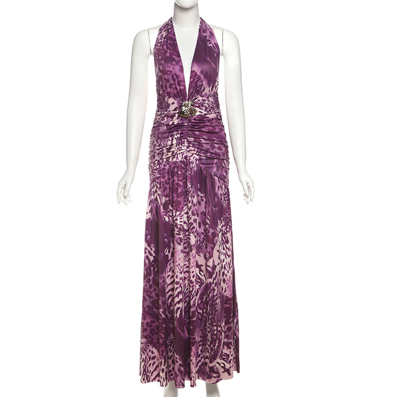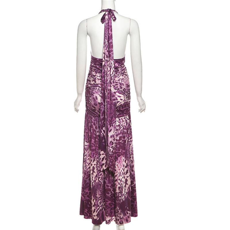 Summer Sexy Leopard Print Deep V Metal Decoration Halter Backless Dress