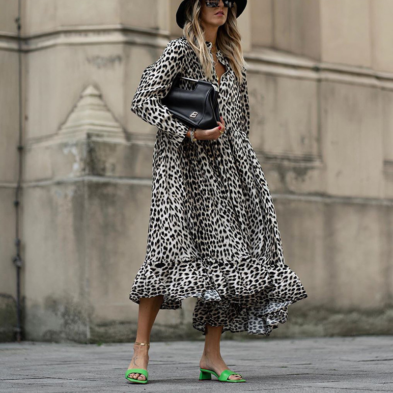 Women's Long Skirt Leopard Print Long Sleeve V-Neck Loose Dress